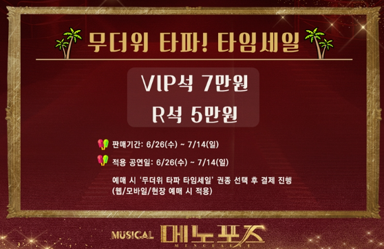 ✅ 무더위 타파! 타임세일로 VIP석은 12만원 → 7만원 / R석은 10만원 → 5만원으로 예매 가능합니다.